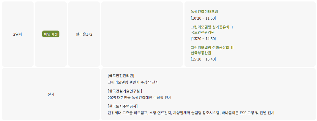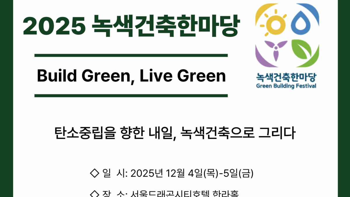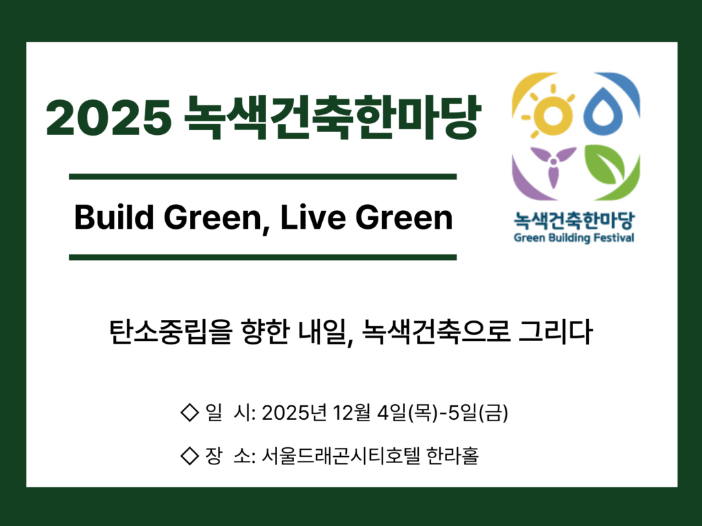 2025-11-10‘2025 녹색건축한마당’이 12월 4일(목) -15일(금) 서울 드래곤시티호텔에서 2일간 개최됩니다.