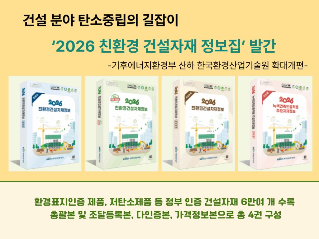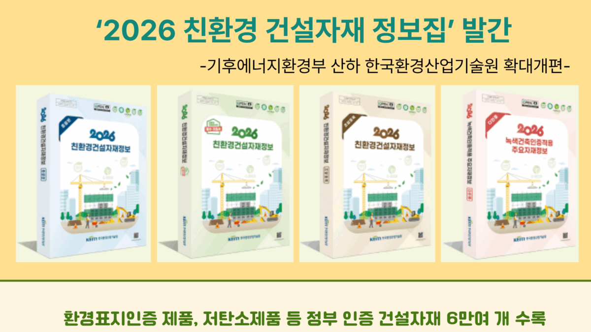 2025-12-12기후에너지환경부 산하 한국환경산업기술원이 12월 10일 수요자 맞춤형으로 확대 개편한 ‘2026 친환경 건설자재 정보집’을 발간하여 안내드립니다.