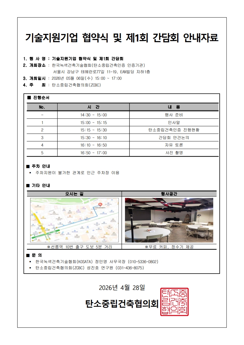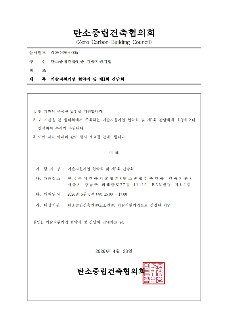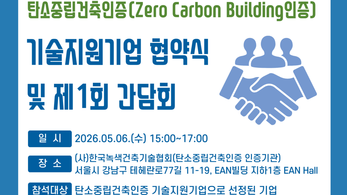 2026-04-272026년 5월 6일(수) EAN Hall에서 탄소중립건축인증 기술지원기업 협약식 및 간담회가 개최되어 안내 드립니다.