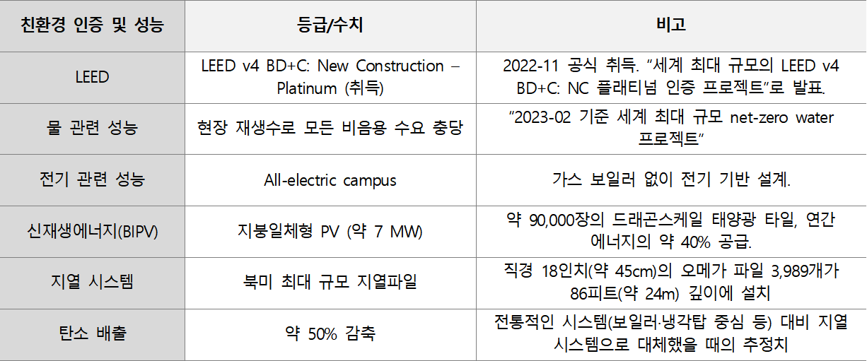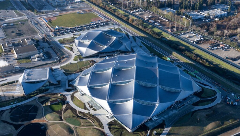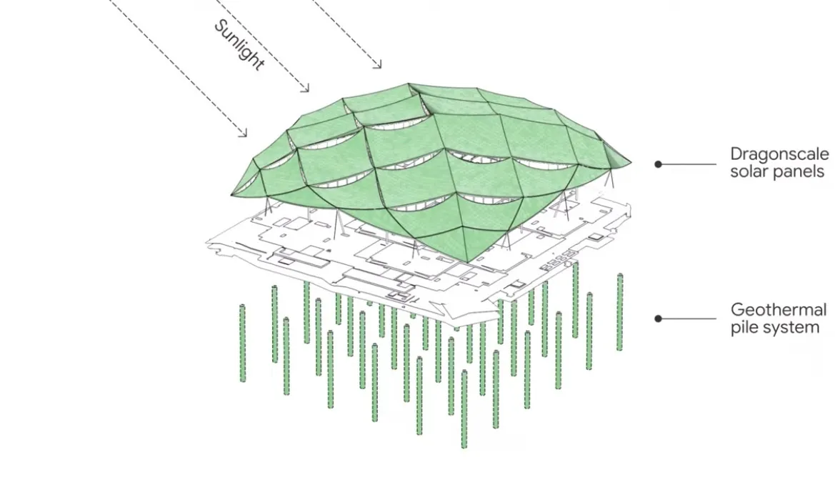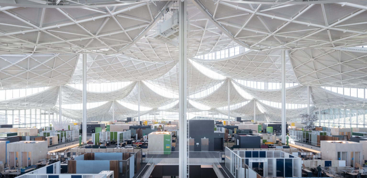 베이 뷰 캠퍼스는 BIG와 Heatherwick Studio, 그리고 Google의 디자인·엔지니어링 팀이 함께 설계한 구글의 첫 ‘ground-up’ 캠퍼스입니다. 실리콘밸리 NASA Ames Research Center 인근 부지에 위치하며, 총 연면적 약 110만 ft²규모입니다. 20에이커(약 7만 8천㎡)의 녹지, 두 개의 오피스 동, 1,000석 규모 이벤트 센터, 240실의 단기 직원 숙소로 구성됩니다. 내부 계획은 구글의 미래 업무 비전을 반영해 협업 욕구와 집중 업무 사이의 균형에 초점을 맞췄고, 팀 공간은 위층, 모임·활동 공간은 아래층으로 배치해 이동성을 높였습니다. 2층은 다양한 floor plate를 적용해 필요에 따라 재구성 가능한 형태로 운영됩니다.