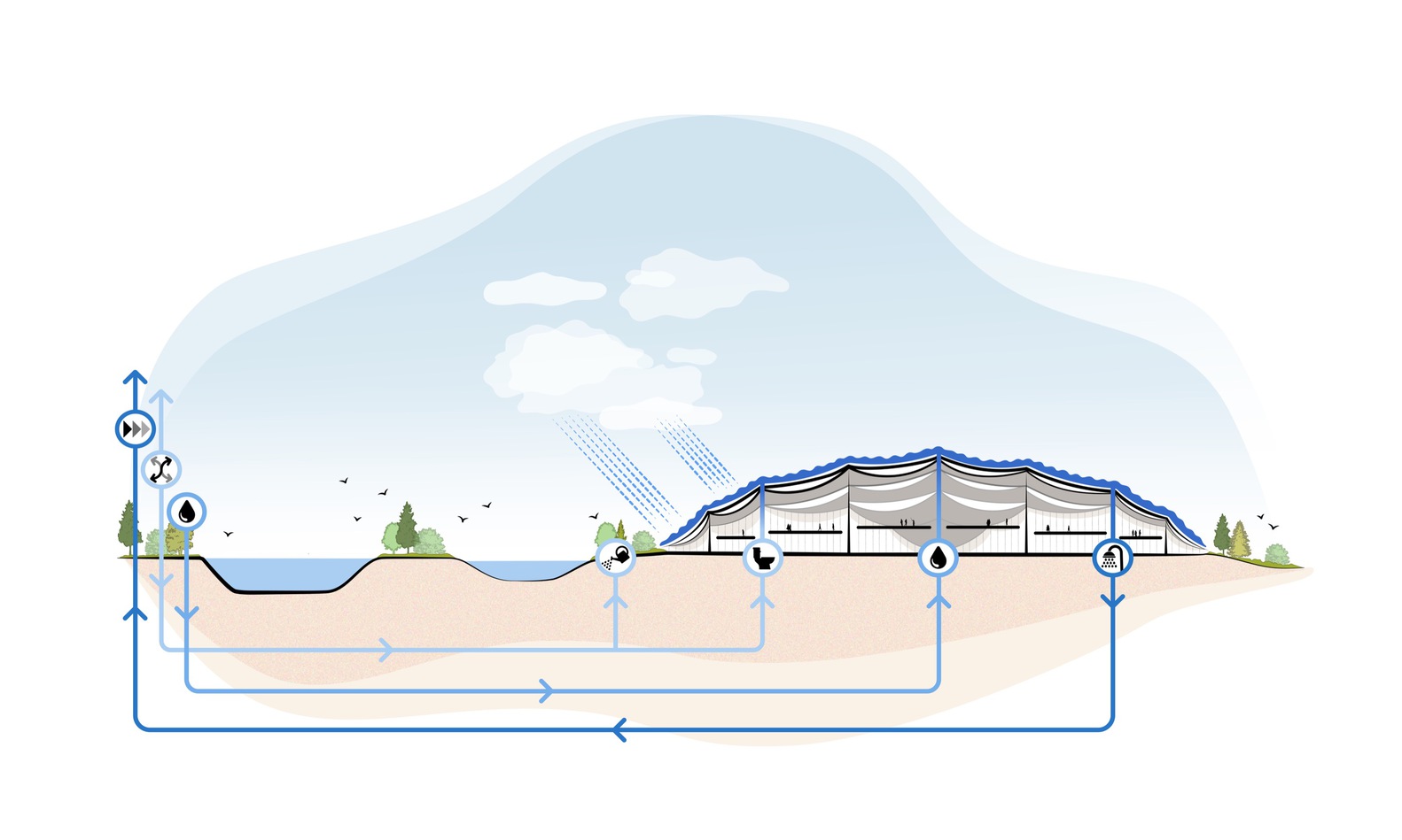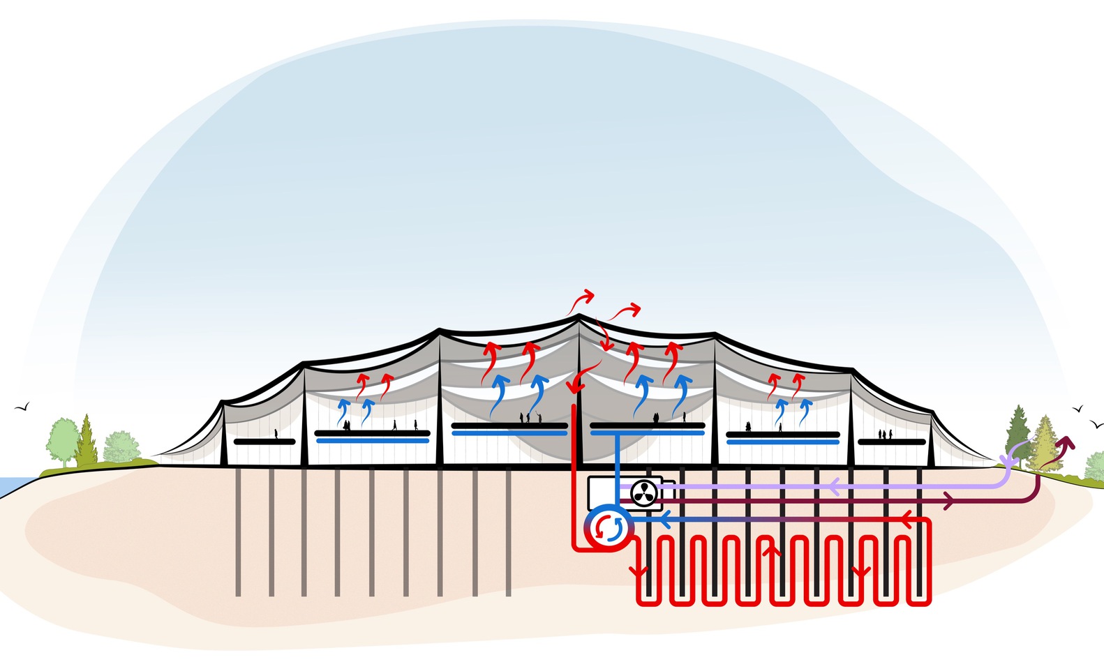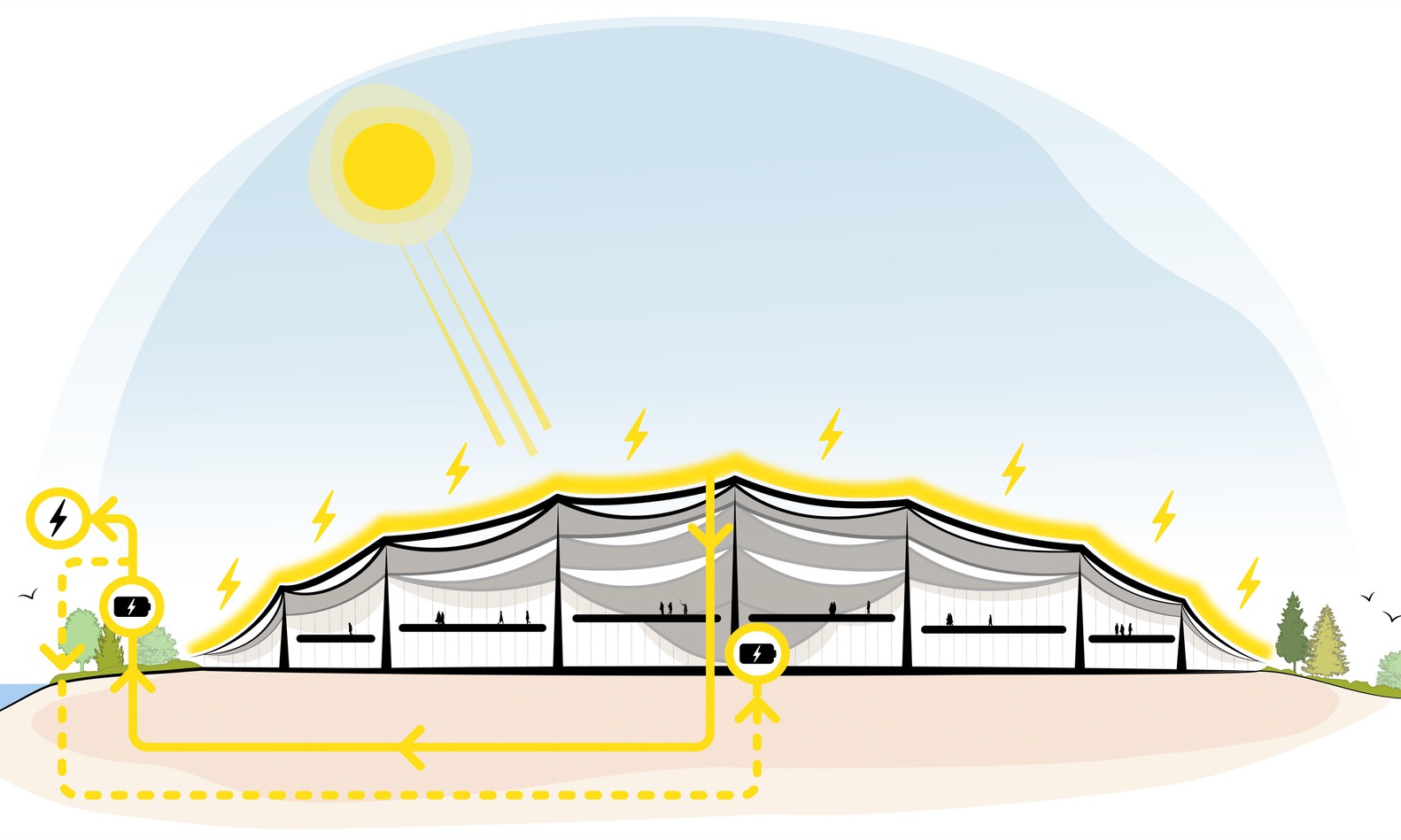 베이 뷰 캠퍼스는 BIG와 Heatherwick Studio, 그리고 Google의 디자인·엔지니어링 팀이 함께 설계한 구글의 첫 ‘ground-up’ 캠퍼스입니다. 실리콘밸리 NASA Ames Research Center 인근 부지에 위치하며, 총 연면적 약 110만 ft²규모입니다. 20에이커(약 7만 8천㎡)의 녹지, 두 개의 오피스 동, 1,000석 규모 이벤트 센터, 240실의 단기 직원 숙소로 구성됩니다. 내부 계획은 구글의 미래 업무 비전을 반영해 협업 욕구와 집중 업무 사이의 균형에 초점을 맞췄고, 팀 공간은 위층, 모임·활동 공간은 아래층으로 배치해 이동성을 높였습니다. 2층은 다양한 floor plate를 적용해 필요에 따라 재구성 가능한 형태로 운영됩니다.