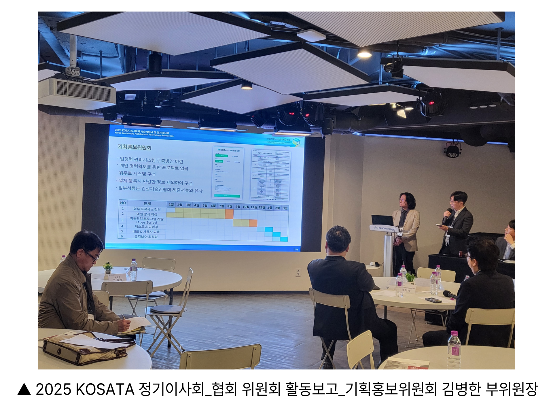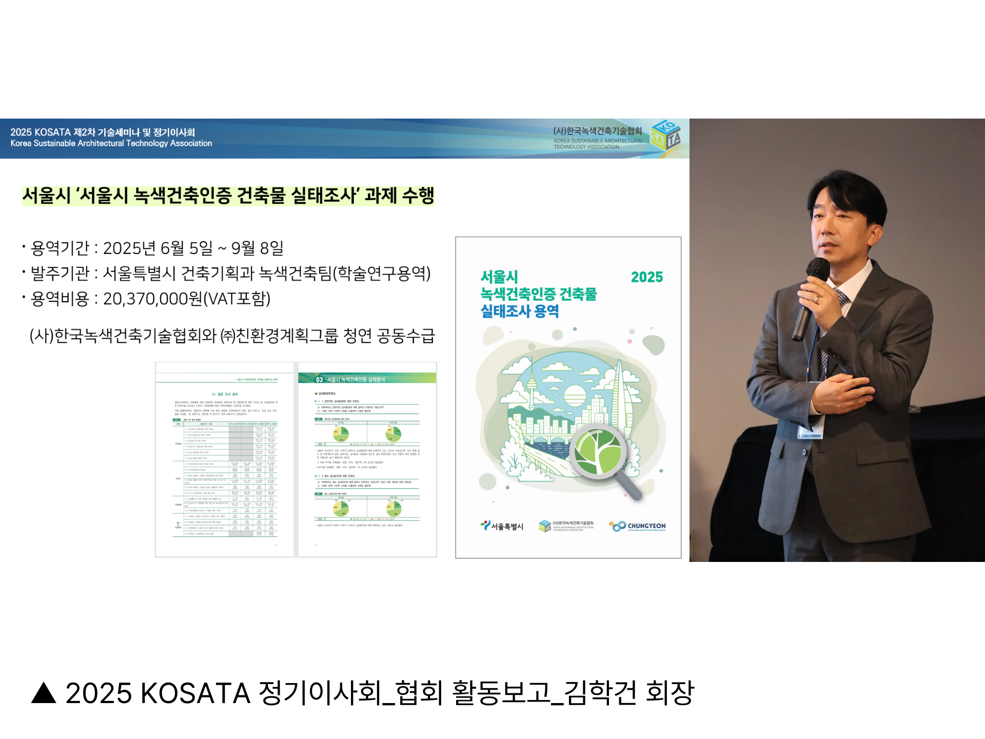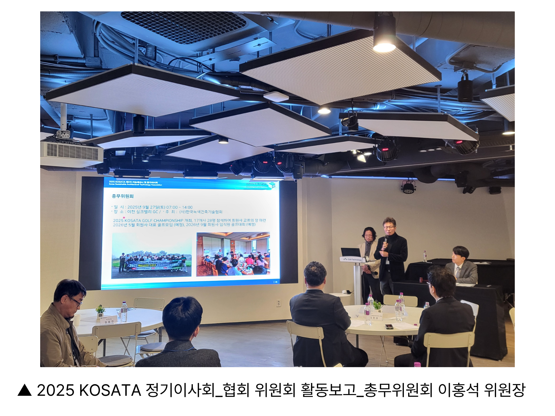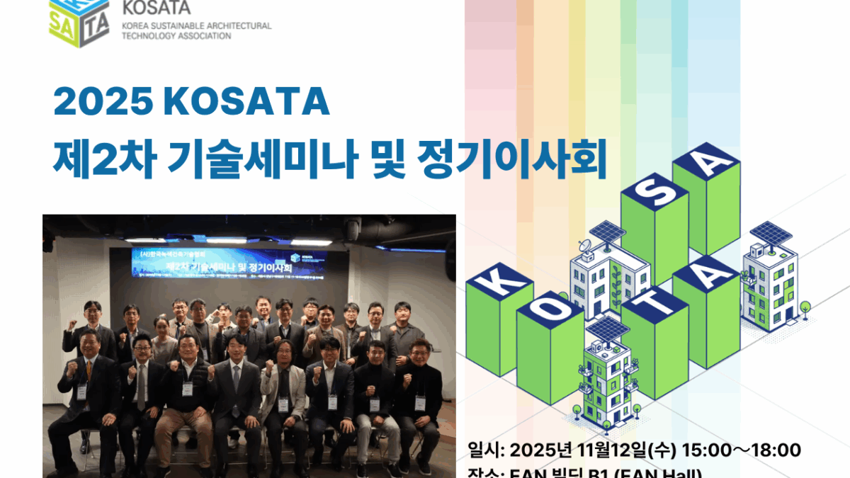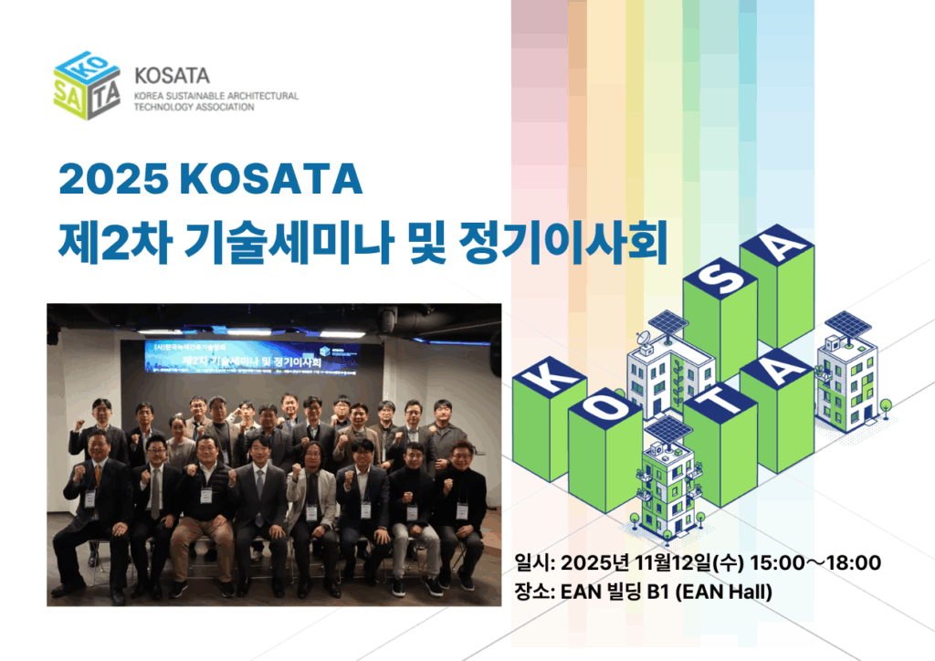 2025-11-132025 KOSATA 제2차 기술세미나 및 정기이사회가 11월12일(수) 개최되었습니다. 이번 세미나에서는 최신 녹색건축기술의 동향과 실무적용 사례에 대해 협회 파트너사와 회원사간 기술정보 공유의 장이 되었습니다. 또한, 탄소중립건축인증의 역할 확대도 논의되어 뜻깊은 시간이 되었습니다.