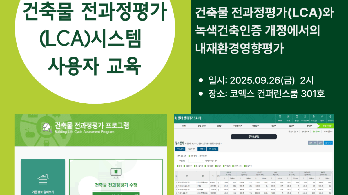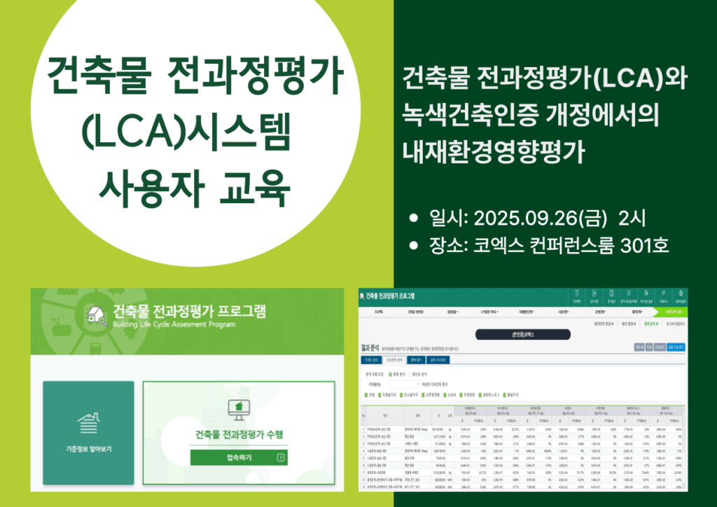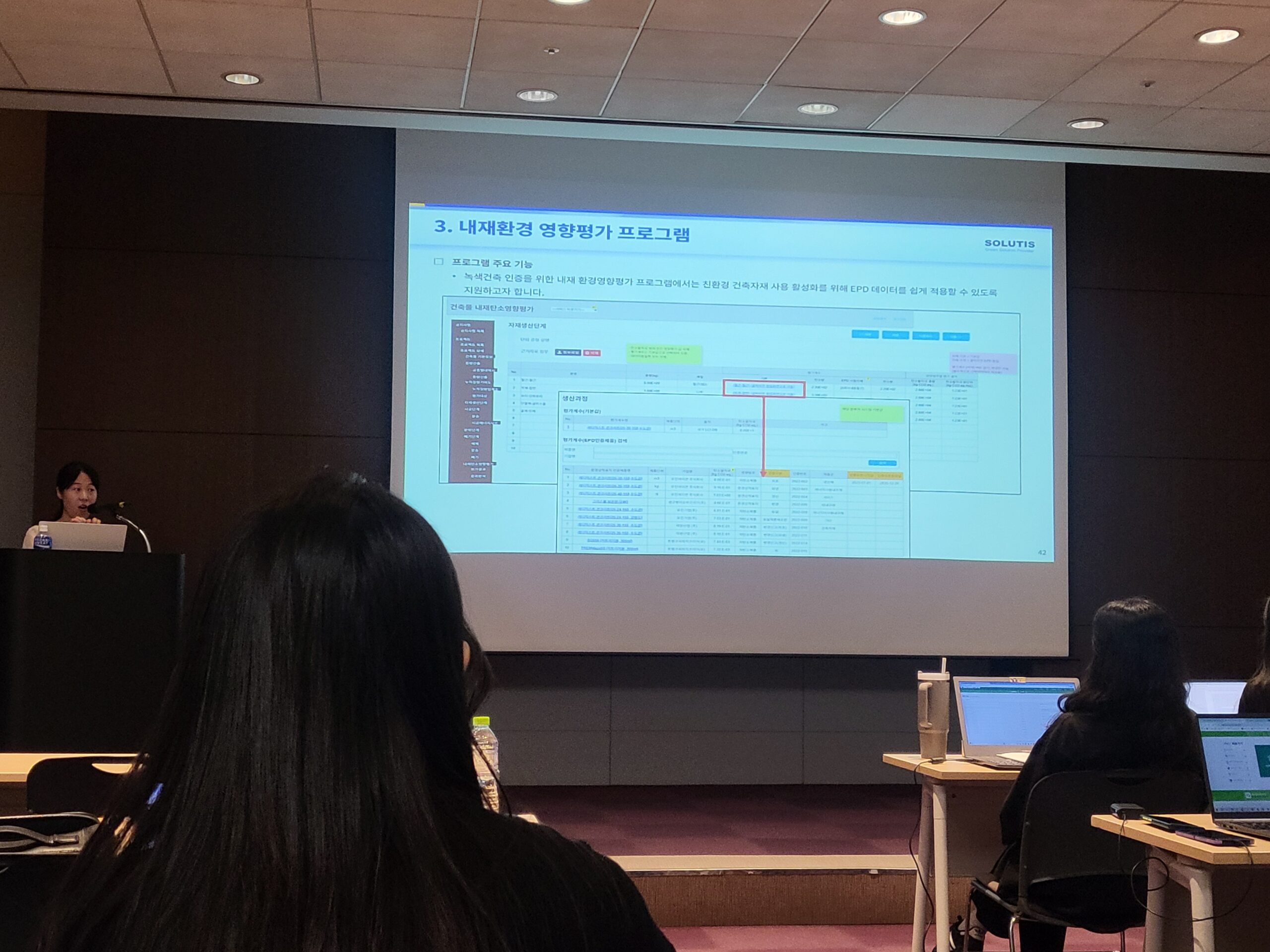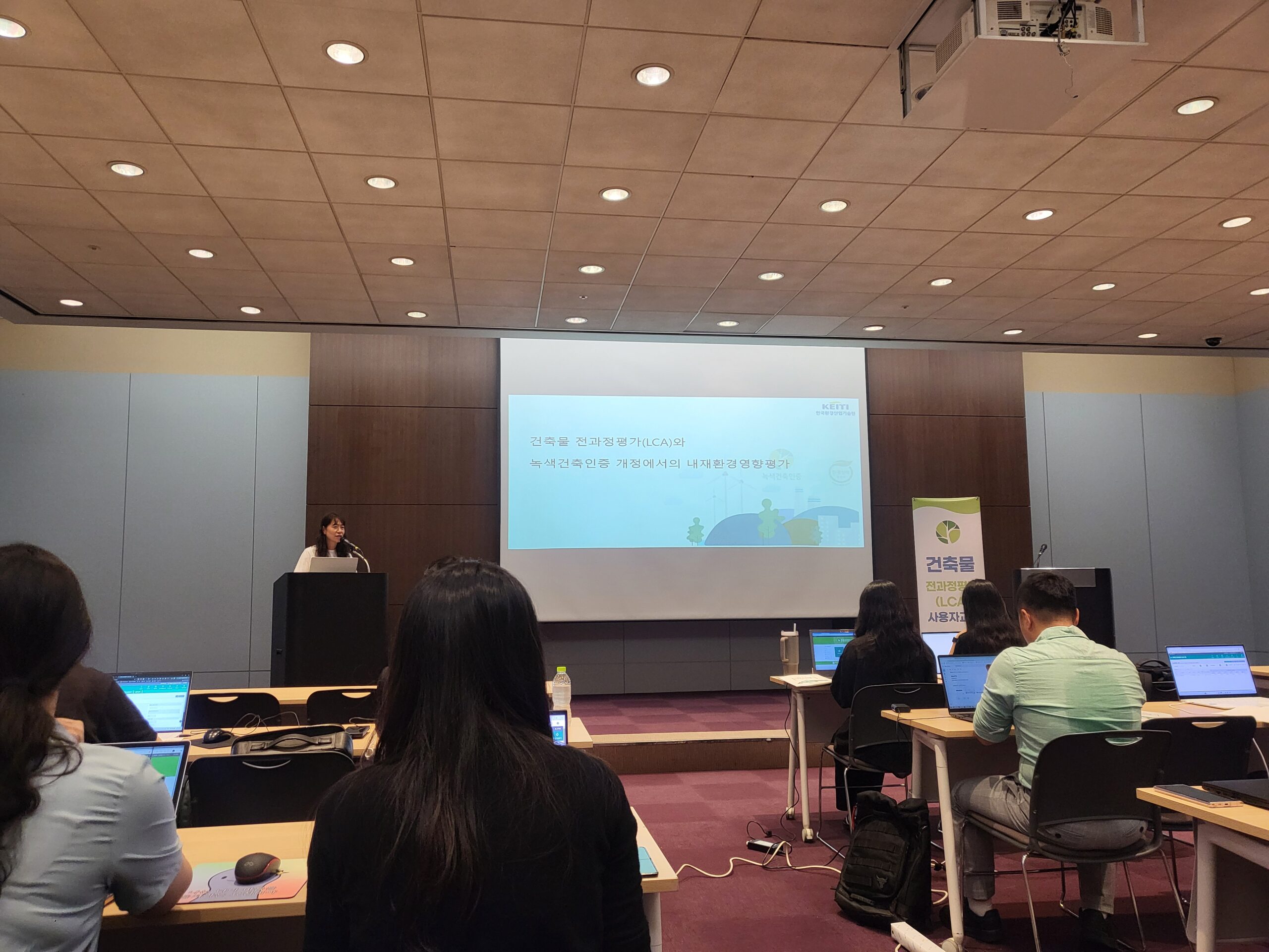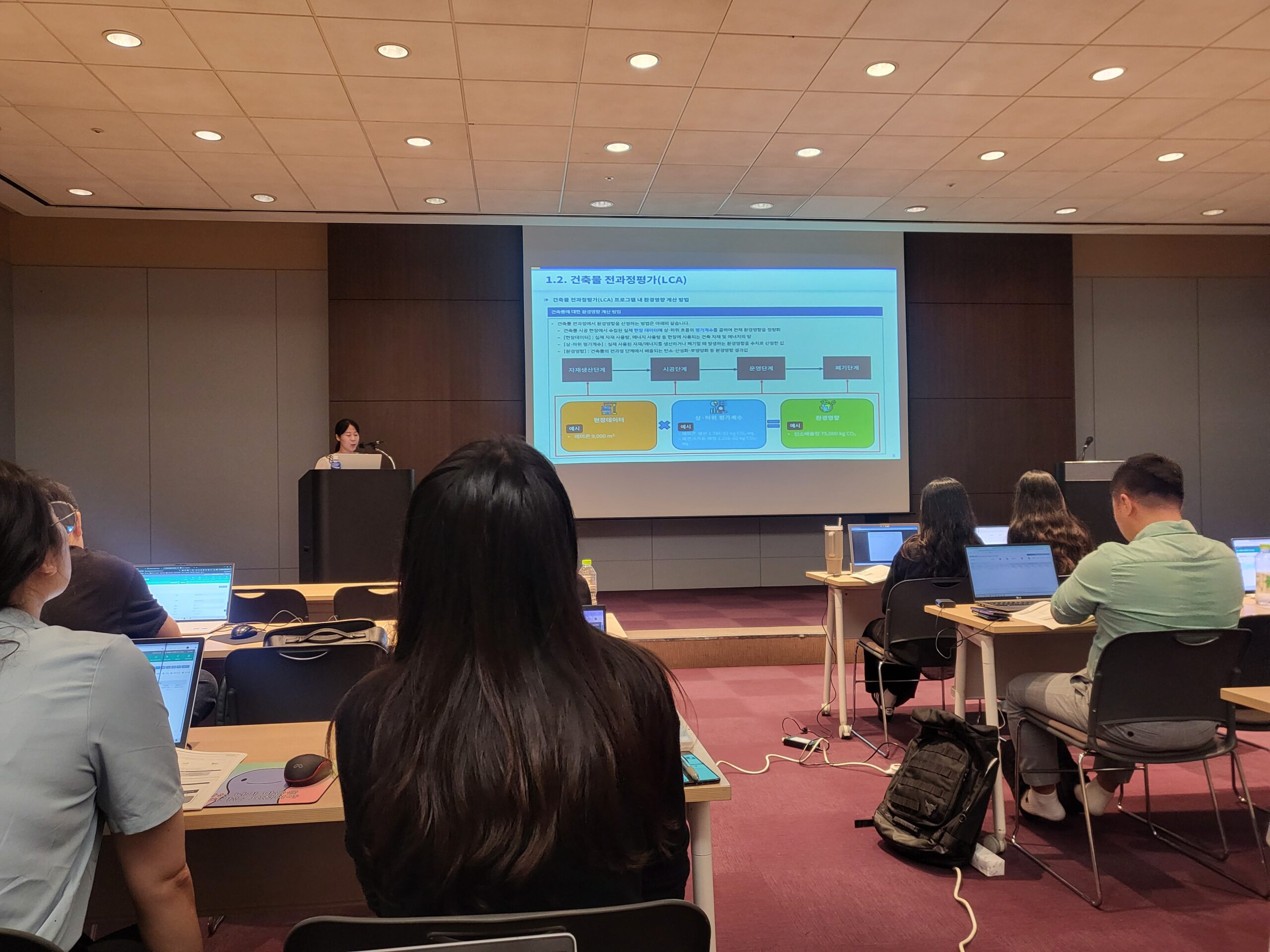 2025-09-29한국산업환경기술원에서 주관한 건축물 전과정평가(LCA)시스템 사용자 교육이 9월26일(금) 코엑스 컨퍼런스룸에서 진행되어 많은 회원사들이 참석하였습니다. 건축물 전과정평가와 녹색건축인증 개정에서의 내재환경영향평가에 대해 서윤경 전임연구원이 발표하였고, 건축물 전과정평가 프로그램 에 대해 (주)솔루티스 고아라 책임연구원의 설명과 실습이 있었습니다.