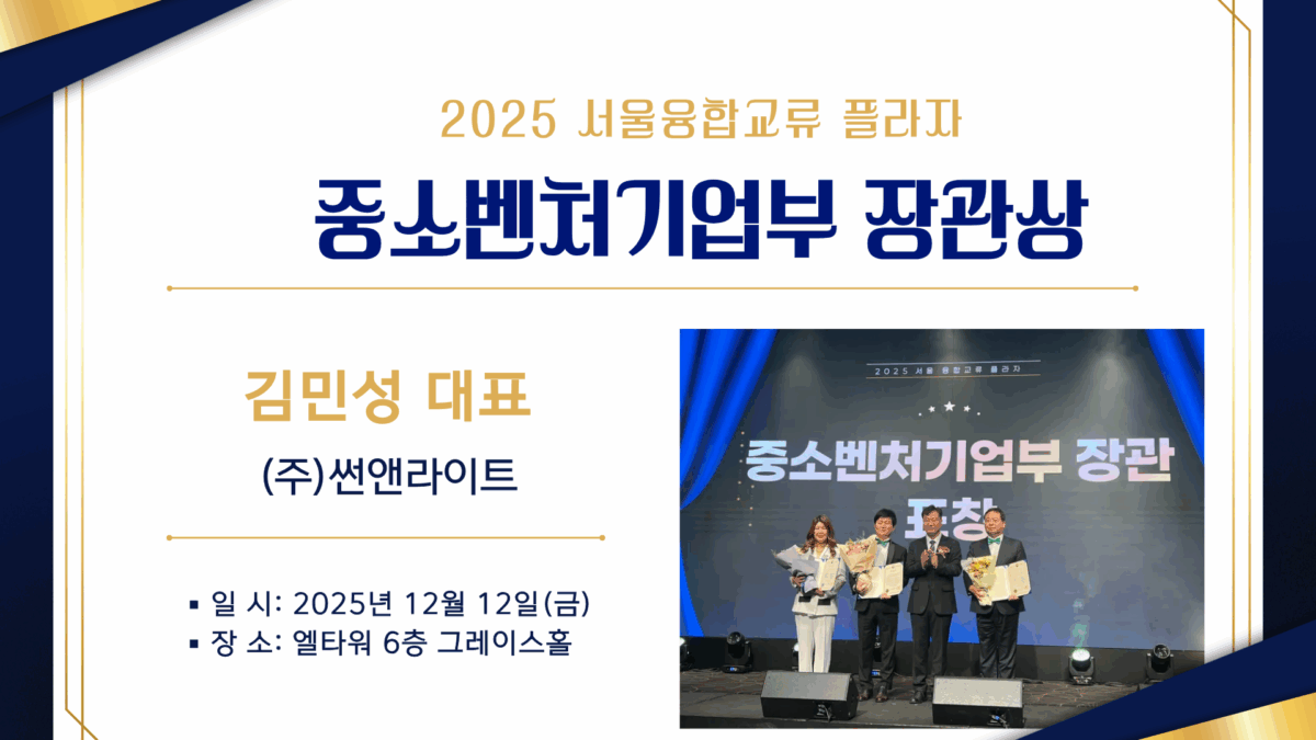 [회원사소식] 2025 녹색건축대전 수상작 발표회2025-12-08 [회원사소식] 중소벤처기업부 장관 표창 2025-12-15 ‘2025 서울융합교류 플라자’에서 KOSATA 탄소중립건축인증센터 센터장이신 김민성 대표이사((주)썬앤라이트)가 중소벤처기업부 장관 표장을 받았습니다. • 일 시: 2025년 12월 12일(금) • 장 소: 엘타워 6층 그레이스홀 • 주 최: (사)중소기업융합서울연합회